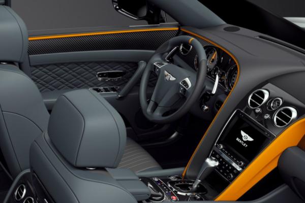 Сиденья особого Bentley обшиты перфорированной кожей. Сквозь верхний слой обшивки проступает цвет, в который окрашены акценты на приборной панели. Кожа на дверных панелях и боковых валиках сидений декорирована ромбовидной прострочкой. Ну а завершают эту роскошную картину вставки Piano Black.