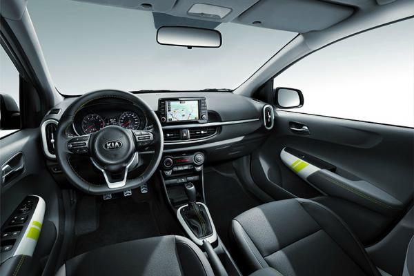 Салон Kia Picanto X-Line отделан искусственной кожей с контрастной прострочкой. На педалях красуются алюминиевые акценты. Задние стекла тонированы, а под бампером закреплена накладка, имитирующая двойной выхлопной патрубок. В набор оснащения входит новая мультимедиа. Система управляется с 7-дюймового экрана и поддерживает интерфейсы Apple CarPlay и Android Auto для "сотрудничества" с мобильными гаджетами.
