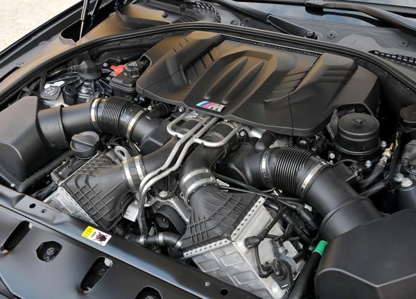Что-что, а уж совершенная управляемость и мощнейшие силовые агрегаты, это лейтмотив отделения Motorsport. Все предыдущие поколения M5 обладали действительно отточенной управляемостью. Модель 2011 года поднимает планку на новую высоту. Начнем хотя бы с мотора. За базу был взят знакомый многим двигатель N63B44 с 8-ю цилиндрами и двойным турбонаддувом, объемом в 4.4 литра, который в стандарте развивал 408 л.с. Достаточно солидно, но для новейшего "снаряда премиум класса" этого было маловато. N63 оснастили новыми распределительными валами, поршнями и новой системой турбонаддува. Кроме того поработали и с выхлопной системой, снабдив двигатель более высокотехнологичным выпускным коллектором. Всю получившуюся конструкцию нарекли новым индексом S63B44TU. Однако и это еще не все! Применили новую систему смазки и бездроссельную систему газораспределения Valvetronic. В результате всего вышеперечисленного мощность мотора возросла до умопомрачительных 560 л.с. по английским стандартам или до 568 л.с. по немецким. Пометка TU в индексе мотора для BMW M5 вовсе не случайна. Это обозначает, что мотор S63B44 подвергся доработке. Немудрено ведь на рынок S63B44 вышел еще в 2009 году, именно тогда стартовали продажи моделей X5 M и X6 M. Основные отличия двигателя TU на M5 образца 2011 года от моторов X5 M и X6 M заключаются в системе Valvetronic, улучшенном впуске и выпуске, а также увеличенном числе максимальных оборотов в минуту - 7200 об/мин. Обновленный двигатель также несколько легче.