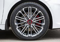 Версия GT внешне довольно существенно отличается от GT Line. У GT вместо противотуманных фар в бампере – хромированные вертикальные перегородки, выполненные в стиле модели Kia Stinger, установлен люк в крыше с электроприводом и оригинальные колесные диски со спортивными шинами Michelin Pilot Sport 4 225/40 R18, из-за которых пришлось пожертвовать запасным колесом, вместо него – ремкомплект. У GT Line шины также от компании Michelin, но чуть меньшего размера – 17-дюймовые, потому в багажном отсеке нашлось место для докатки.