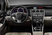 Спортивная тема прослеживается и в интерьере кроссовера. Удобные сиденья с электрическими регулировками и развитой боковой поддержкой обиты качественной кожей. Трехспицевый руль в стиле Mazda MX-5 с кожаной отделкой оснащен кнопками управления аудиосистемой и круиз-контролем. Приборы по-спортивному спрятаны в три колодца, кстати, абсолютно черных при выключенном зажигании. Однако при повороте пластиковой рукоятки, выполняющей роль ключа зажигания, они вспыхивают красно-синей подсветкой, при этом в нулевом положении стрелки спидометра и тахометра смотрят вертикально вниз.