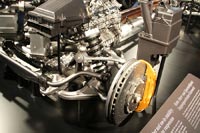 Однако гораздо интереснее то, что все колёса у Mercedes-AMG GT R – управляемые. На скоростях превышающих 100 км/ч задние колёса поворачиваются в ту же сторону, что и передние, а до 100 км/ч – в противоположную. В первом случае повышается устойчивость движения, а во втором – уменьшается радиус поворота. Нужно заметить, что задние колёса способны отклоняться на угол не более 1.5 градусов. Управление ими осуществляется по проводам при помощи сервоприводов, представляющих собой сочетание электромотора с ходовым винтом.