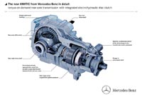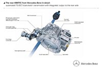 Одной из интересных особенностей новой трансмиссии является PTU (Power Take-off Unit) – компактный блок отбора мощности, полностью интегрированный в коробку передач с двумя сцеплениями 7G-DCT и имеющий с ней общую систему смазки. По сравнению с теми конструкциями, у которых отбор мощности осуществляется при помощи узла с собственной системой смазки, решение Mercedes-Benz на 25% легче. Вдобавок оно отличается хорошим КПД.