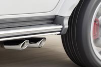 | Характерная решётка радиатора, крупные воздухозаборники в бампере и выпускные трубы, выходящие под левой задней дверью – важные отличительные признаки версии Mercedes-AMG G 63 |