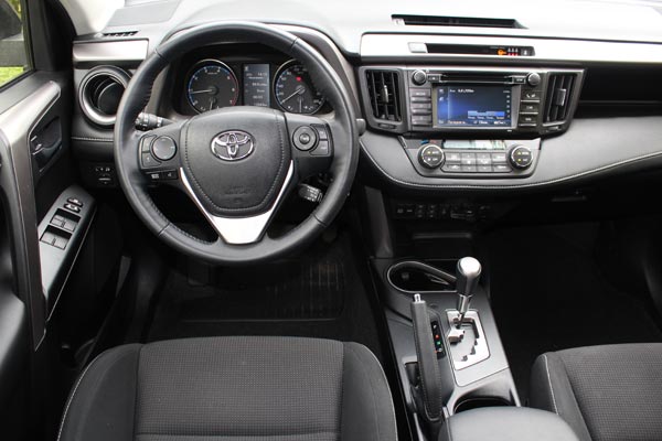 Когда осенью прошлого года представляли обновленный Toyota RAV4, маркетологи компании утверждали, что рассчитывают на то, что новый дизайн сможет привлечь молодых покупателей. И действительно ставка на дизайн оказалось верной, узкие фары и передний бампер в стиле новейшей модели Mirai заметно освежили облик кроссовера. Он теперь выглядит авангардно, но в тоже время новый дизайн не оттолкнет и прежних поклонников данной модели. Открываешь дверь и видишь прежний, уютный интерьер. Приземляешься на водительское кресло и думаешь, а много ли для счастья надо. Форма кресла оптимальная, подушка сиденья длинная, диапазон регулировок огромный. Кажется, здесь ничего не изменилось, по-прежнему простенькие материалы отделки, впрочем, отличия есть, но они не бросаются в глаза. Оплетка руля теперь из настоящей кожи. В комбинации приборов появился цветной информационный дисплей, на который можно вывести множество всякой информации, в том числе и режимы работы трансмиссии.
