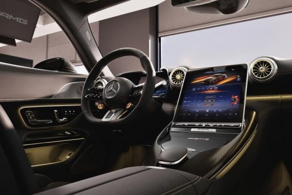 Этот же цвет выбран для контурной подсветки салона и декоративных элементов торпедо и дверных карт. Ковши-кресла AMG Performance отделаны микроволокном и кожей Nappa. Центральный тоннель "обнимают" углепластиковые накладки. Под ноги седокам брошены особые коврики с вышивкой APXGP.