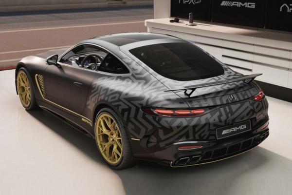 Особый AMG GT выдержан в стиле киношного APXGP. Матовый окрас кузова сочетается с золотистыми акцентами на деталях обвеса, решетке радиатора и порогах. Часть внешних панелей выполнена из углепластика. На корме стоит большое активное антикрыло. На колеса повешены 21-дюймовые диски, выполненные в золотистом колере.