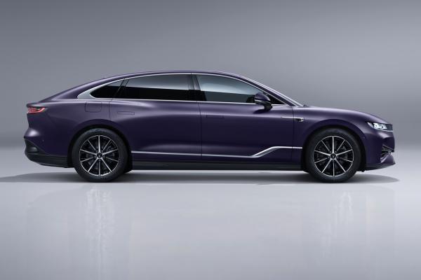 Гибридный седан отличается от электрического оформлением передка. Здесь стоит полноценная решетка радиатора вместо фальш-панели. На колеса повешены иные 20-дюймовые диски. На корме - спойлер, рассеченный надвое светящимся "плавником" стоп-сигнала. Переднего багажника нет, поскольку там стоит бензиновый мотор.