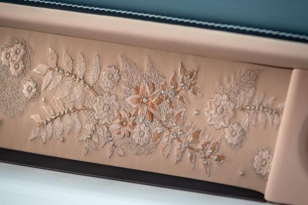 Кружевные изображения в виде цветов и листьев украсили торпедо перед пассажиром и задний подлокотник. Среди материалов отделки для интерьера дизайнеры Rolls-Royce также использовали бежевую и белую кожу. Динамики аудиосистемы покрыли сетками с вкраплением позолоченных нитей.