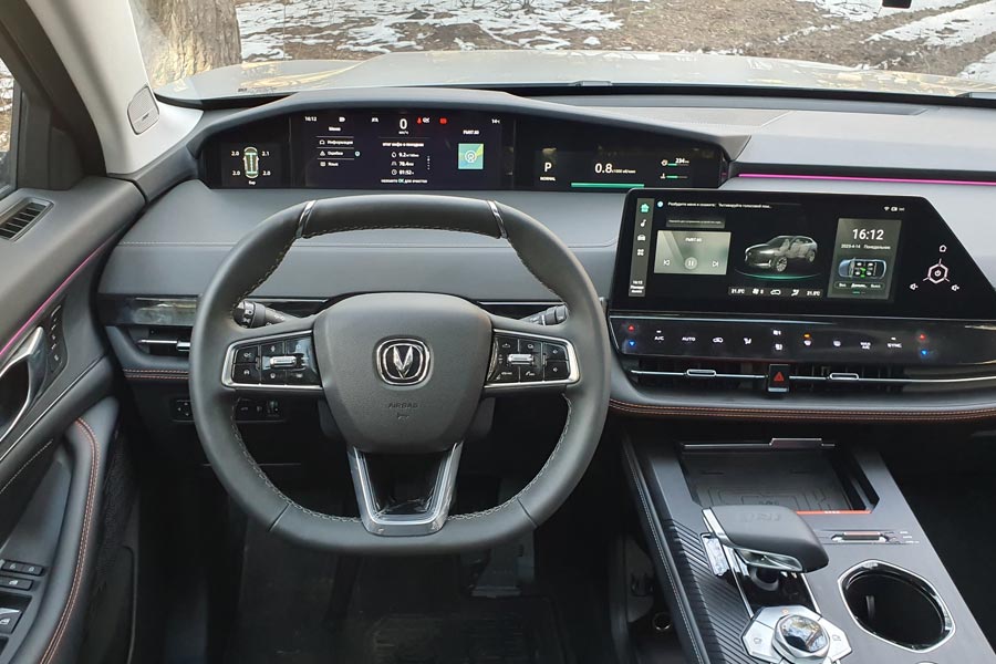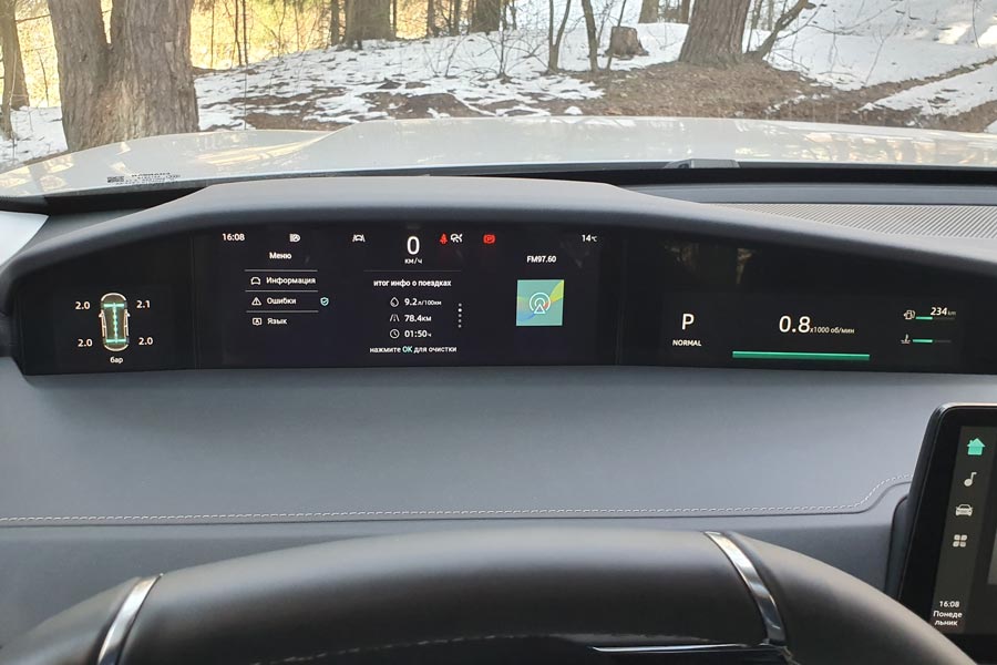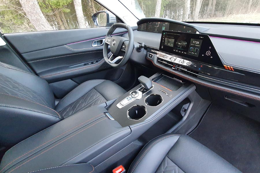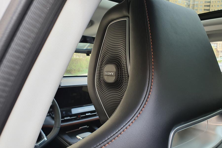 Клавиши на руле нажимаются с приятным усилием. Климат-контроль двухзонный с отдельным блоком регулировки. Подстаканники и шайба выбора ездовых режимов, как и руль выполнены в виде шестигранников. Селектор управления автоматической коробки передач нефиксируемый. В целом эргономика хорошая, но при быстром вращении шестигранный руль неудобен, и его обод частично перекрывает панель приборов. В дверные карты и подголовник водителя встроены динамики Sony с качественным объемным звучанием.