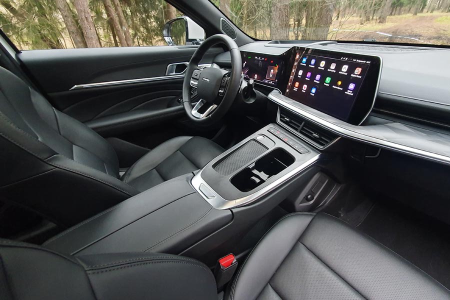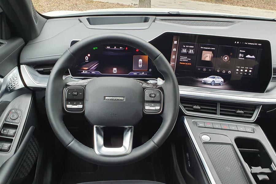 Левый подрулевой рычаг перегружен функциями. Неудобно. Включатель поворотников - нефиксированный, но работает четко, привыкания не требует. Руль с пухлым ободом и массивной квадратной ступицей - не такой, как в F7. Он снят с рамного внедорожника Haval H9, но в интерьер кросс-купе, претендующего на спортивный статус, вписался хорошо...
