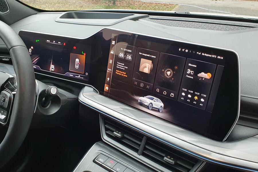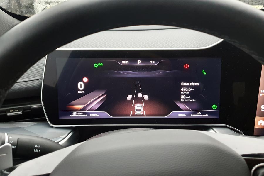 Картинка, кстати, классная. Она выводится на большой 14,6 дюймовый экран мультимедиа, который "приклеен" к виртуальной приборке и слегка развернут к водителю. Работает система шустро. Есть голосовое управление и сервисы "Яндекс" с навигацией. Из недостатков - оба дисплея бликуют. Аналоговых кнопок почти нет, даже управление ручным тормозом и настройки климат-контроля перебрались в виртуальное меню. Ох уж эта цифровизация.