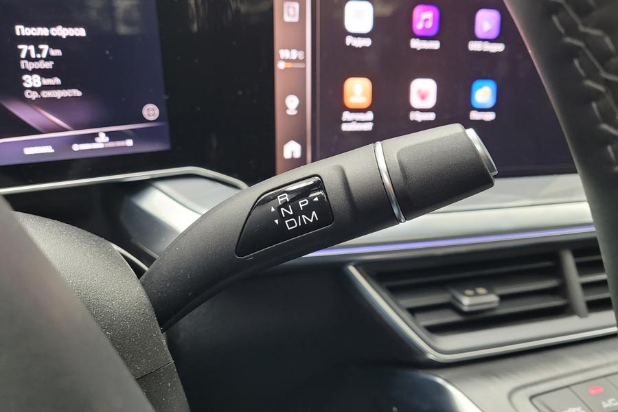 Селектор трансмиссии теперь не на тоннеле, а под рулем справа. Это решение набирает популярность среди современных китайцев. Мне же привычнее шарить там в поиске рычага включения дворников. Машина, конечно, ругается. Я хочу очистить стекло, а она сообщает, что задняя передача при движении вперед недоступна. Спасибо, кэп!