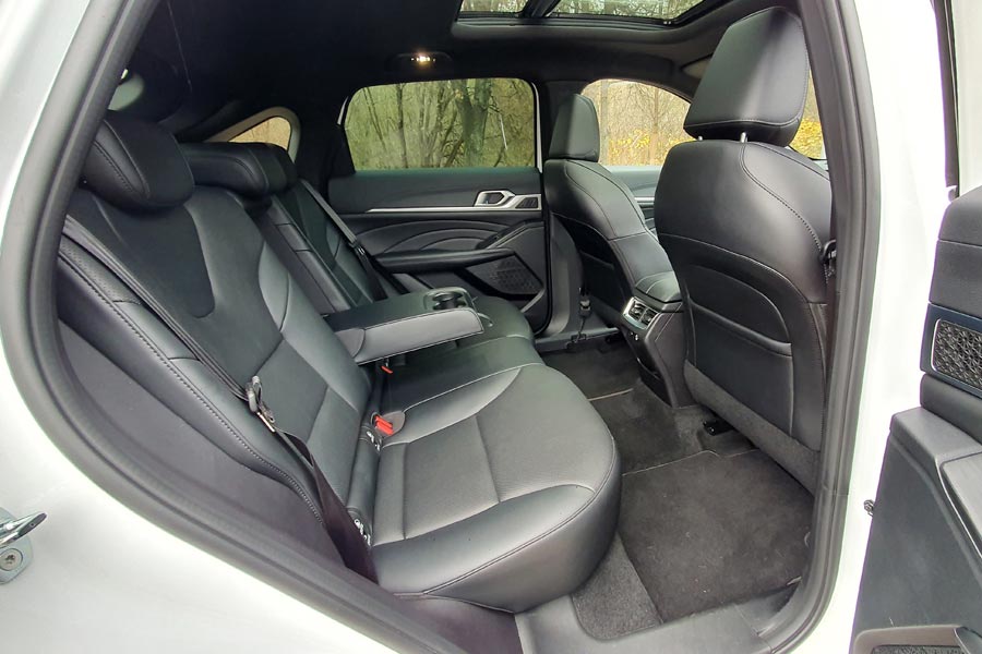 Длина F7x в точности совпадает с собратом. В нем 4,78 метра от носа до хвоста, так что в салоне воздуха хватает. На галерке не тесно троим взрослым. Ниспадающая крыша каким-то чудом не давит на голову. Пространства для ног море. Сиденья греются и регулируют спинки по наклону. На торце тоннеля есть свои дефлекторы обдува и разъем для зарядки гаджетов.