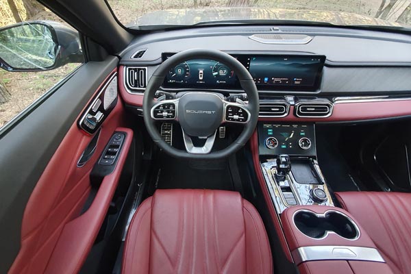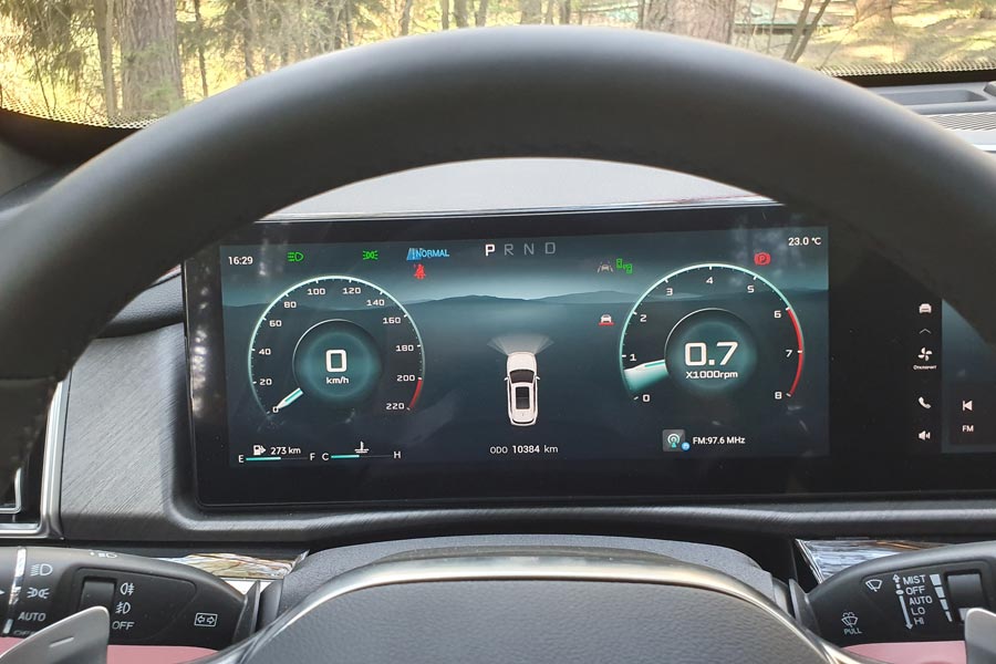 Часто бывает, что младшие братья оказываются более талантливыми, чем старшие. Так произошло и в случае с Soueast. Тестируя флагманскую модель, мы обнаружили немало мелких огрехов в эргономике. На удивление, у Soueast S07 их гораздо меньше! Здесь нормальная цифровая панель приборов, визуально объединенная с экраном мультимедийной системы в один экран (каждый с диагональю 12,3 дюйма). У мультимедиа хорошие быстродействие и графика, удобный интерфейс, есть поддержка приложения Apple CarPlay. У комбинации приборов есть классический вариант с круглыми шкалами спидометра и тахометра. Руль тоже нормальный, круглый, лишь слегка подрезанный снизу, правда, верхняя часть рулевого колеса перекрывает верх приборной панели, где размещены часы и значение наружной температуры. Все функции управления трехзонным климат-контролем вынесены на отдельный дисплей. Селектор управления автоматической коробки передач выполнен в виде кристалла.