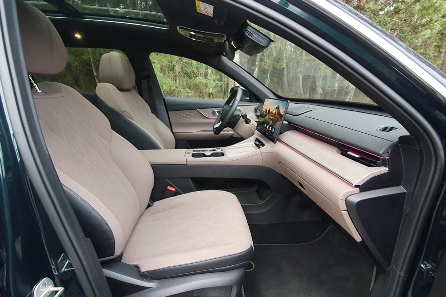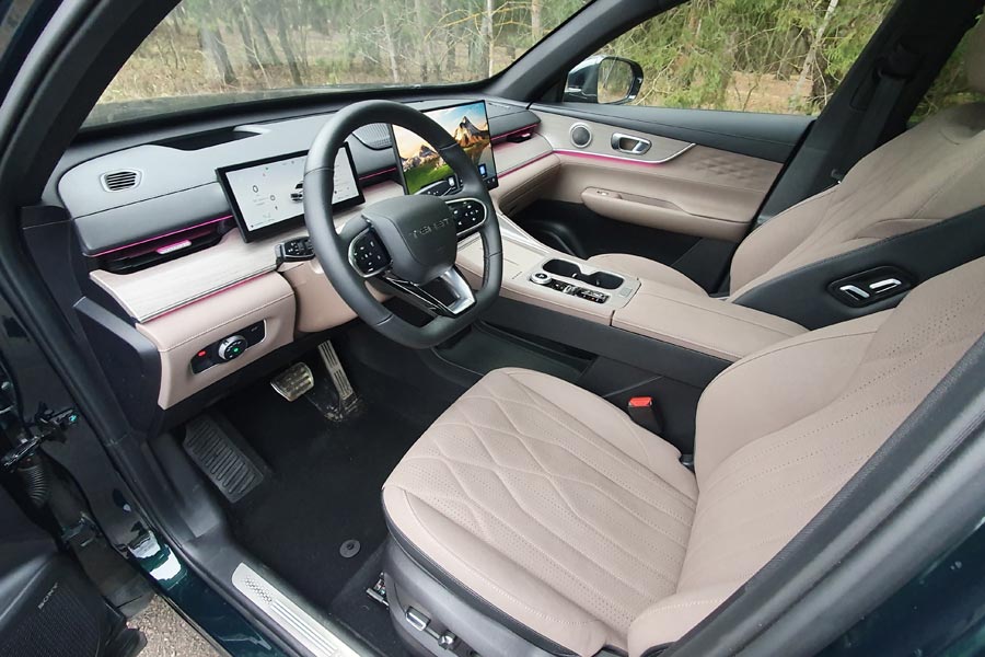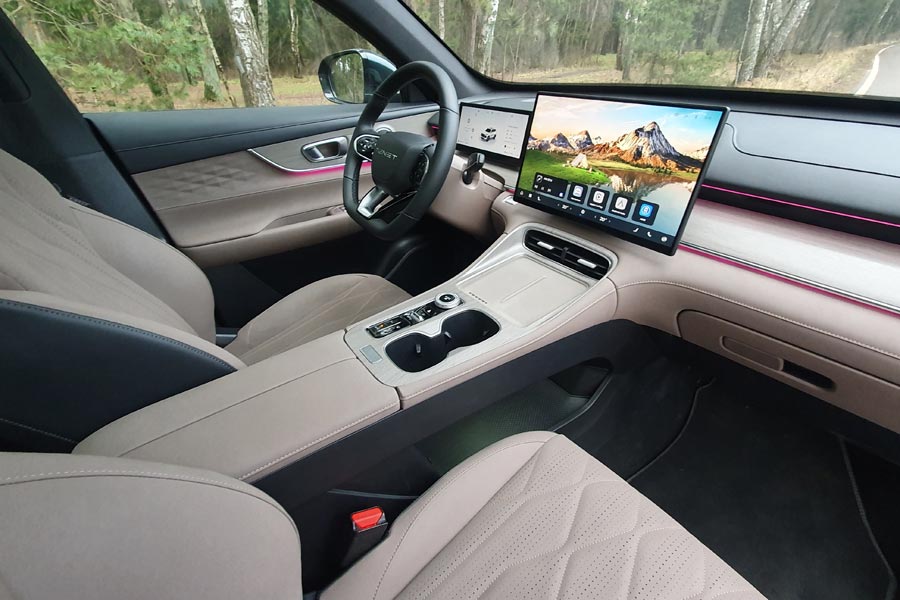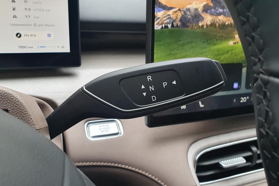 Интерьер стильный и уютный. Благодаря большой панорамной крыше в салоне светло даже в пасмурные слякотные осенние дни. У автомобиля в максимальной комплектации Ultra красивая бежевая обивка из материала Eco Skin. Он хотя и синтетический, но на ощупь представляет собой нечто среднее между кожей и алькантарой. Кресла оптимальные как по форме, так и по плотности набивки. Есть электропривод и вентиляция передних сидений, водительское – с памятью настроек. Из минусов – переднее пассажирское кресло не регулируется по высоте. Селектор переключения роботизированной коробки передач расположен на рулевой колонке, он требует небольшого привыкания, но на самом деле – удобный.