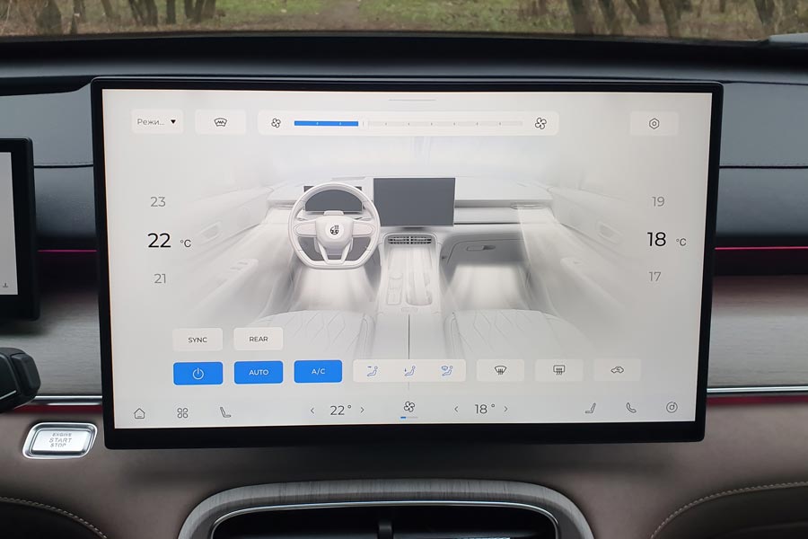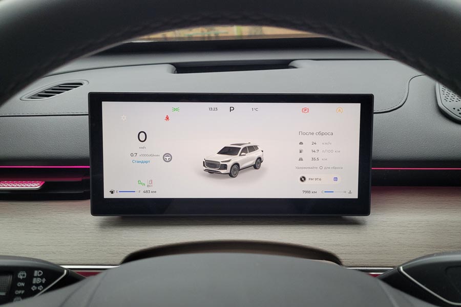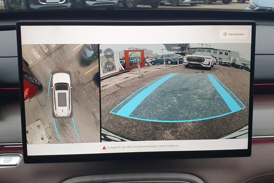 По центру – «телевизор» с диагональю 15,6 дюймов. Быстродействие у него хорошее, картинка с камер кругового обзора четкая. Есть беспроводная зарядка для смартфонов, но она рассчитана только на большие аппараты, телефоны среднего размера сдвигаются во время движения на скользкой площадке и перестают заряжаться.