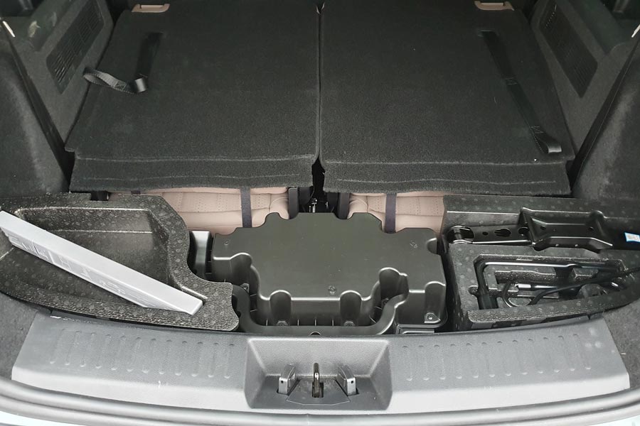 Дверь багажного отсека с электроприводом. При сложенном третьем ряде кресел места для поклажи много. Под полом есть органайзер для мелких предметов. Докатка размещается в заднем свесе под днищем, и не ограничивает объем багажного отсека. Сиденья второго и третьего ряда раскладываются в ровный пол.